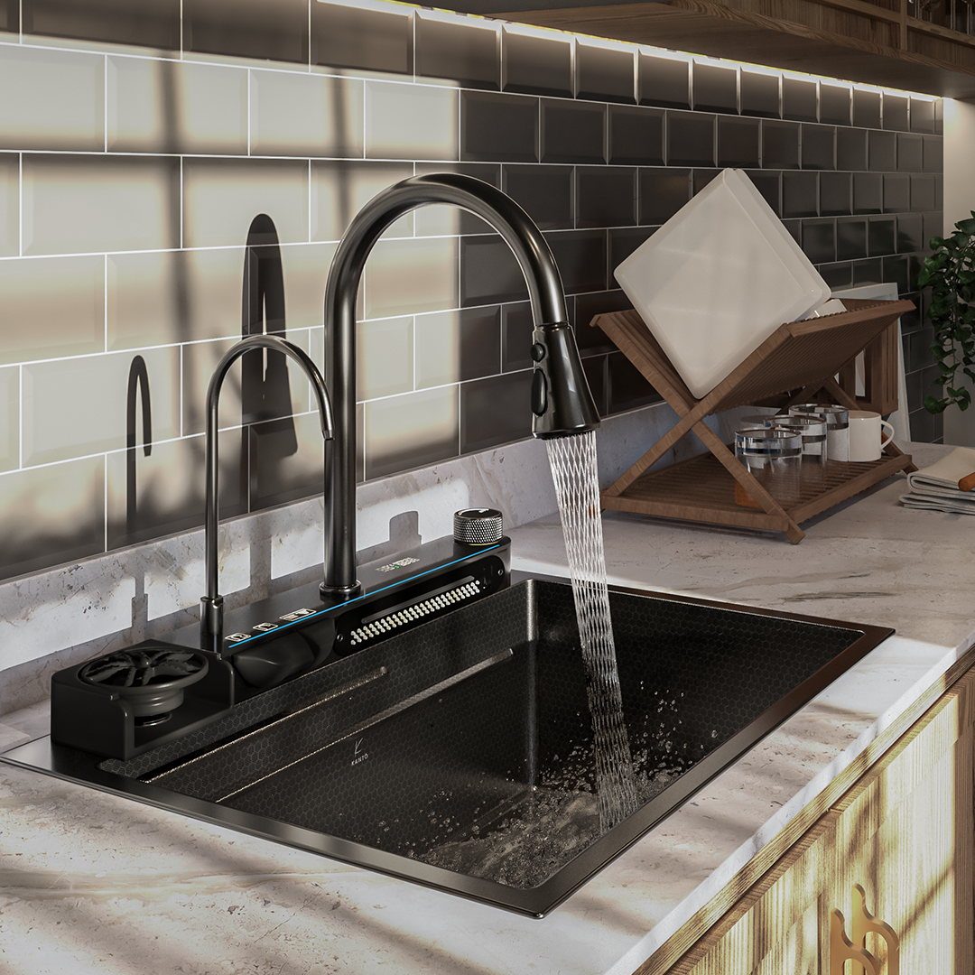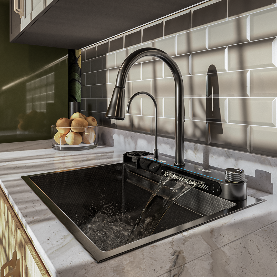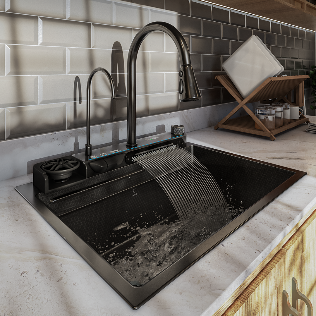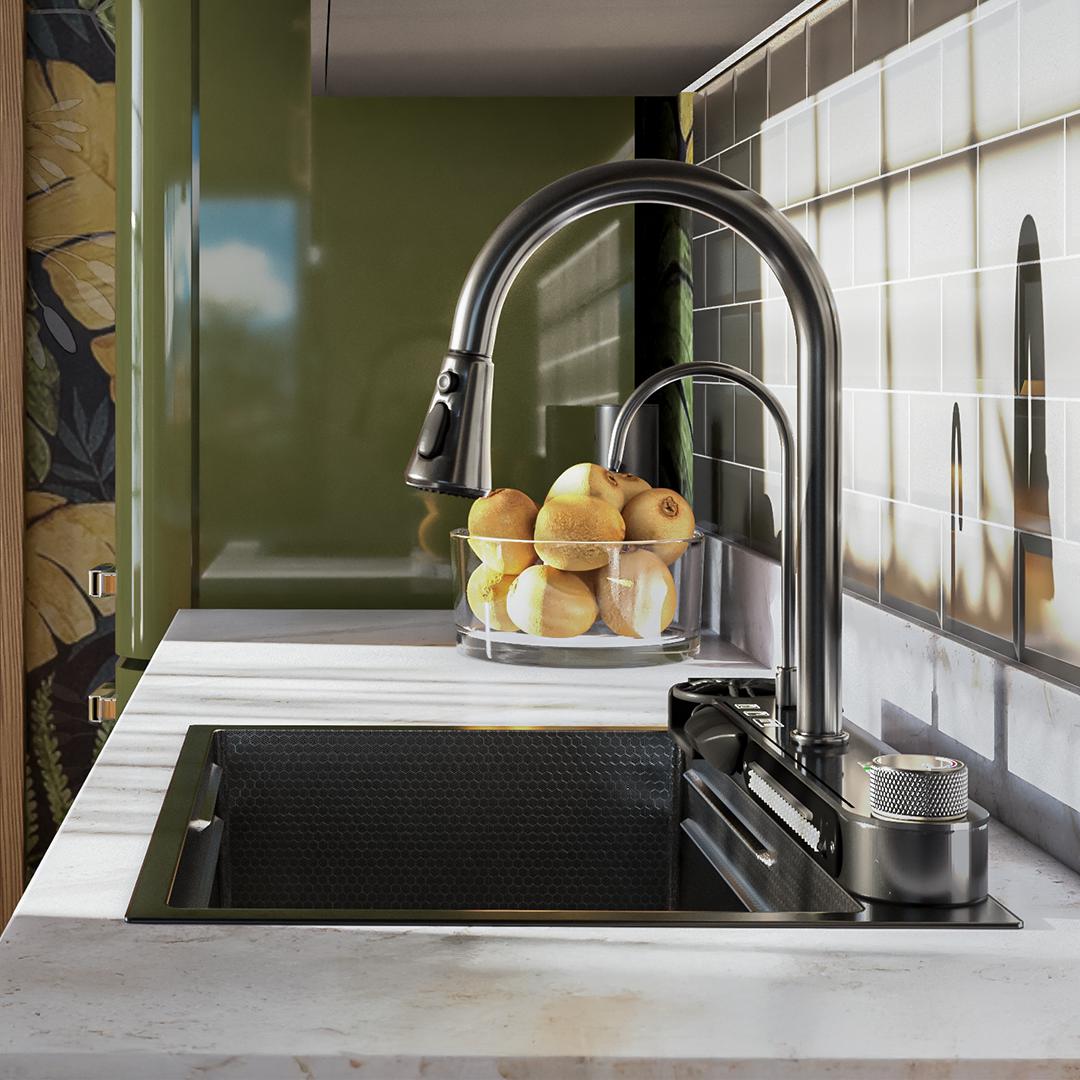 Equipado con grifería extraíble y múltiples modos de flujo de agua, permite un lavado más cómodo, versátil y preciso, tanto para utensilios como para alimentos.