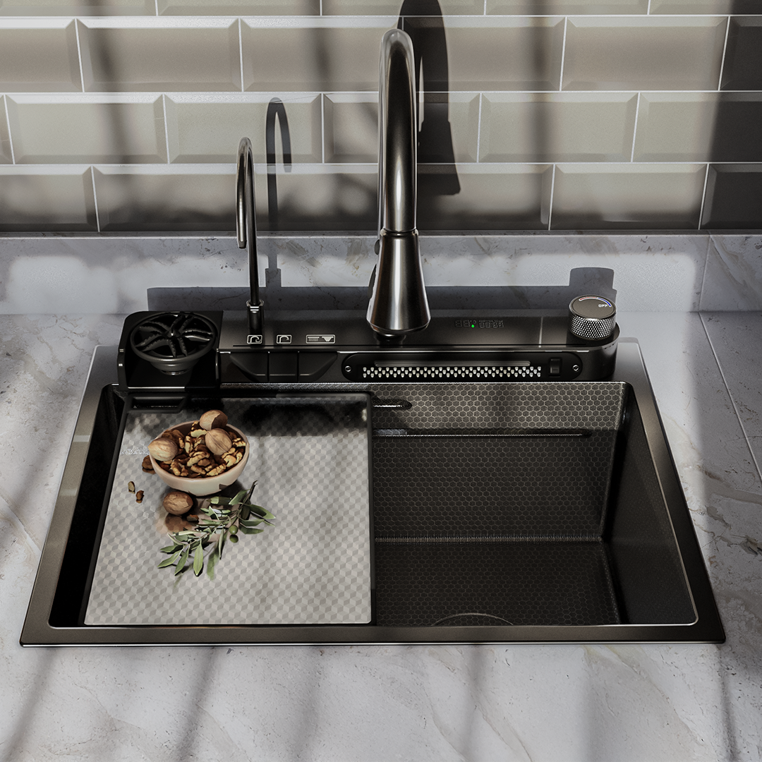 Con una propuesta inteligente de diseño, integra accesorios que optimizan cada rincón de la zona de lavado y hacen más ágiles las tareas del día a día. Incluye una tabla de picar en acero inoxidable, higiénica y práctica, que no absorbe olores ni líquidos, además de un lavavasos de alta presión que limpia copas y vasos en segundos. Su dispensador de jabón incorporado mejora la organización y la estética del espacio, mientras que su canasta desmontable para alimentos permiten lavar frutas o verduras de forma cómoda y eficiente.